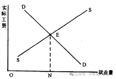 所以1规定了劳动的需求曲线,是随工资增长降低的D线,2规定了劳动的供给曲线,是随工资增长的S线,换种说法是,工资越高,劳动者越愿意打工,工资越低,资本家越愿意雇人,这两种意愿经过经济学反映的交点,就是工资。