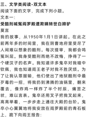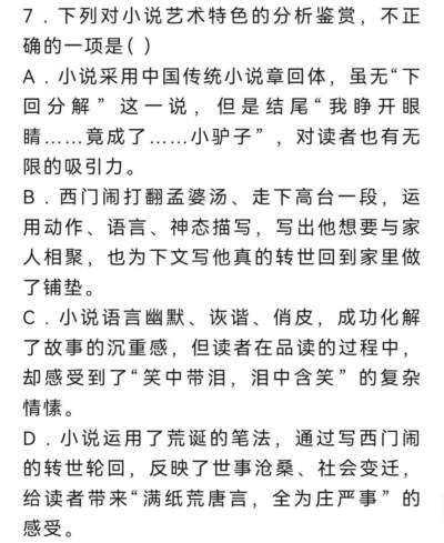 然后,在例题下列出了ABCD四个对莫言小说《生死疲劳》里面这段话的理解,提问学生哪一项理解是错的。最终,出题方给学生的答案是ACD是正确的,B是错的。