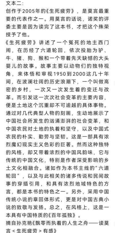 接着引用孙克艳吹捧莫言的评论文章,强调“创作于2005年的《生死疲劳》,是莫言最重要的代表作之一。用莫言的话说,诺奖的评委主要是因为读完了这本书,才把这个殊荣授予了他。”并指出《生死疲劳》讲述的是“一个冤死的地主西门闹”的故事,“这是一部具有浓烈魔幻现实主义色彩的巨著”,“在风格上,这是一本具有中国特质的《百年孤独》”。