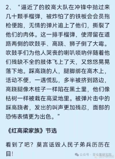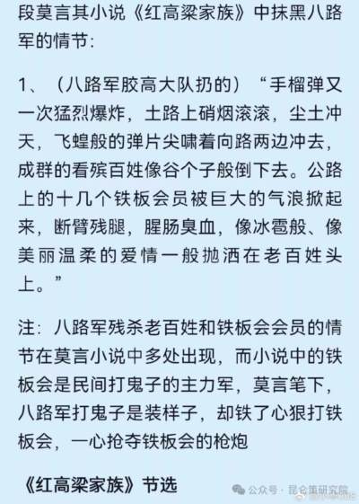 3、问题是,莫言小说《红高粱家族》中有八路军胶高大队向看热闹和送殡的群众中乱扔手榴弹,造成群众惨重伤亡的情节,难道也是浙江出版联合集团所谓“小说中人物有成长过程和认识过程;人物语言和部分描写是为小说塑造人物所需要的,只能代表该人物在特点历史环境中的立场和观点”吗?问题是,八路军是人民的队伍,奉行严格的三大纪律、八项注意,他们能向自己的父老乡亲扔手榴弹吗?