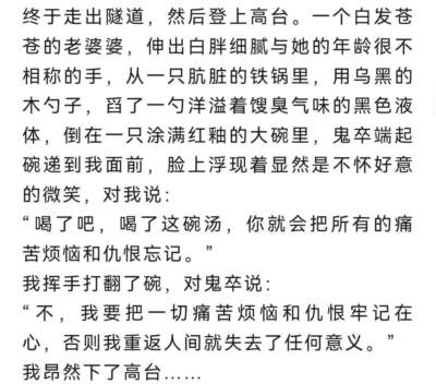 “喝了吧,喝了这碗汤,你就会把所有的痛苦烦恼和仇恨忘记。”