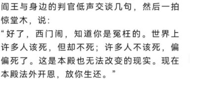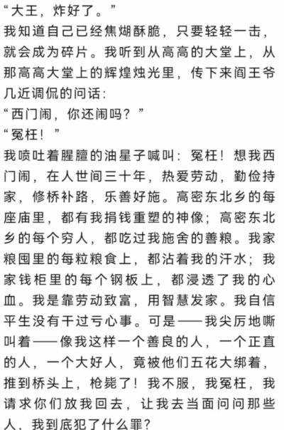 我喷吐着腥膻的油星子喊叫:冤枉!想我西门闹,在人世间三十年,热爱劳动,勤俭持家,修桥补路,乐善好施。高密东北乡的每座庙里,都有我捐钱重塑的神像;高密东北乡的每个穷人,都吃过我施舍的善粮。我家粮囤里的每粒粮食上,都沾着我的汗水;我家钱柜里的每个钢板上,都浸透了我的心血。我是靠劳动致富,用智慧发家。我自信平生没有干过亏心事。可是——我尖厉地嘶叫着——像我这样一个善良的人,一个正直的人,一个大好人,竟被他们五花大绑着,推到桥头上,枪毙了!我不服,我冤枉,我请求你们放我回去,让我去当面问问那些人,我到底犯了什么罪?