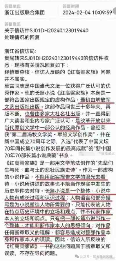 “《红高粱家族》是一部用文学笔法创作的"先辈们生与死、血与土的悲壮民族史诗"。作为一部虚构的小说作品,不能用纪实报告文学的眼光去看待,小说所讲述的故事也不能当作现实中发生的历史事件去对待。长篇小说是一个整体,小说中人物有成长过程和认识过程;人物语言和部分描写是为小说塑造人物所需要的,只能代表该人物在特点历史环境中的立场和观点,并不代表作家本人的立场和观点。只有把一部长篇小说当作一个整体,才能判断作家本人的思想倾向;对作品任何断章取义的理解,都容易造成对整部作品本身和作家本人的误读。因此,信访人所反映的《红高粱家族》一书的这些问题属于断章取义和误读,不存在导向问题。”