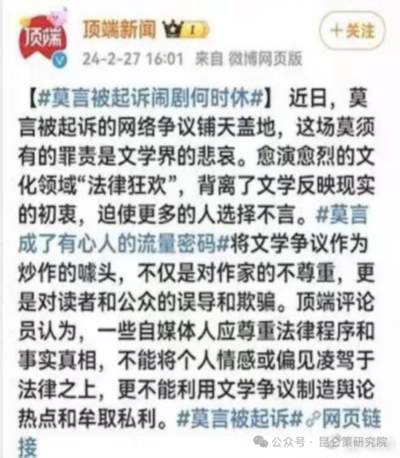 “莫言被起诉的网络争议铺天盖地,这场莫须有的罪责是文学界的悲哀。愈演愈烈的文化领域"法律狂欢",背离了文学反映现实的初衷,迫使更多的人选择不言。#莫言成了有心人的流量密码#将文学争议作为炒作的噱头,不仅是对作家的不尊重,更是对读者和公众的误导和欺骗。顶端评论员认为,一些自媒体人应尊重法律程序和事实真相,不能将个人情感或偏见凌驾于法律之上,更不能利用文学争议制造舆论热点和牟取私利。”