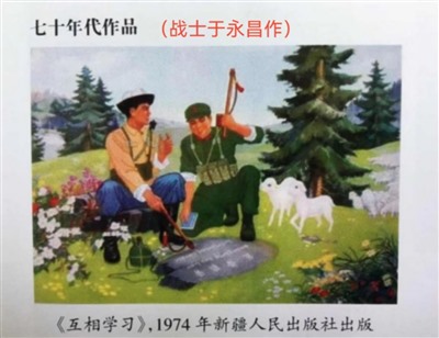 1972年,我随部队转战到新疆莎车,在新疆人民出版社出版了第一件年画《互相学习》,画的是一个解放军战士和牧羊民兵用汉和哈萨克族语言文字交流“反修防修”。新疆革命委员会宣传部长林勃民对这件作品大为赞赏,留我在乌鲁木齐继续创作《演兵天山》,纪念新疆解放20周年。我与战友田黎明合作了这件作品,画的是军民擎着反修字样的红旗,在天山牧场训练打坦克,在全国连环画报发表后好评多多。我在甘肃日报发表了第一篇文章《当兵、学兵、画兵》,在解放军文艺发表的第一件作品《“十大”光辉暖人心》,有一天在收发室看到有六份报纸同时登了我的画。我是远在边疆的普通一兵,却经常收到报刊杂志和出版社的编辑们来信,指导我的创作。我回河北探家时路过北京,在王府井新华书店看到自己的年画《互相学习》挂在里面出售,心里乐啊!