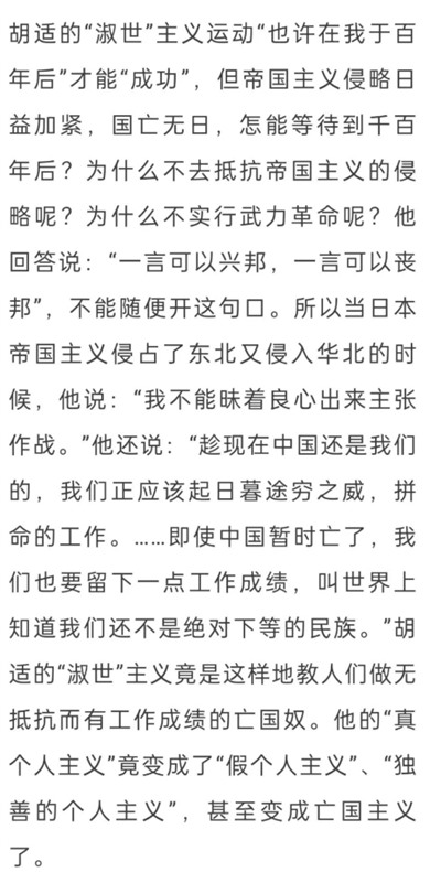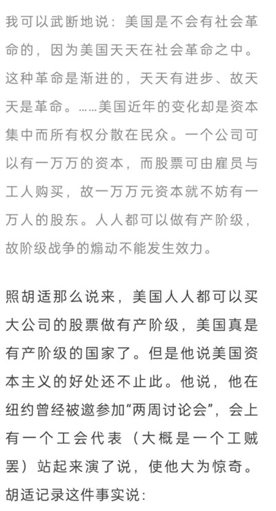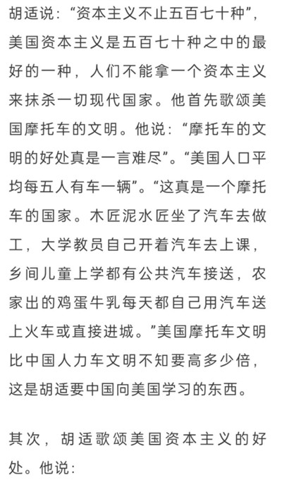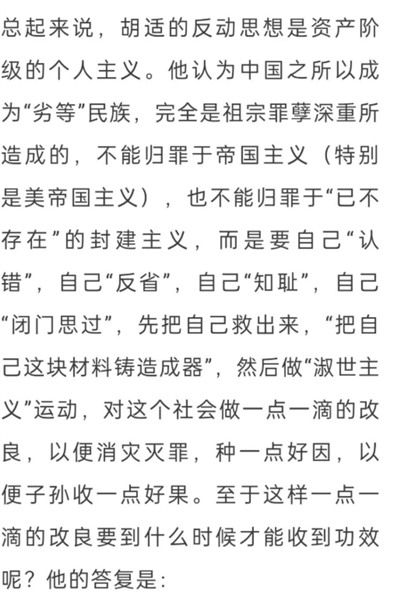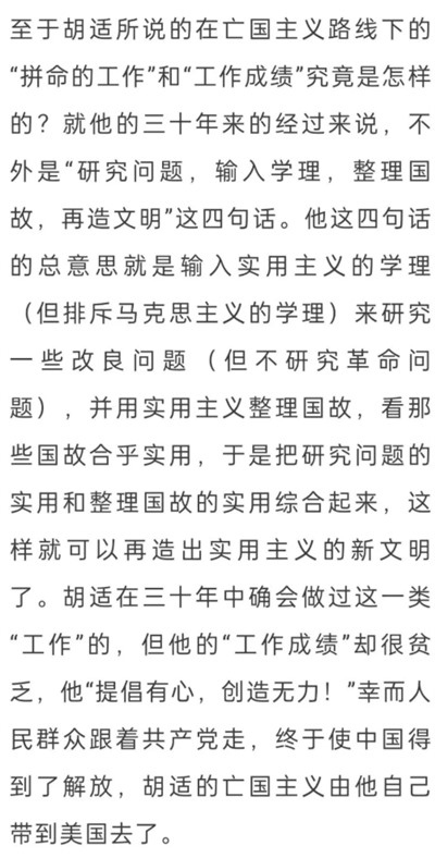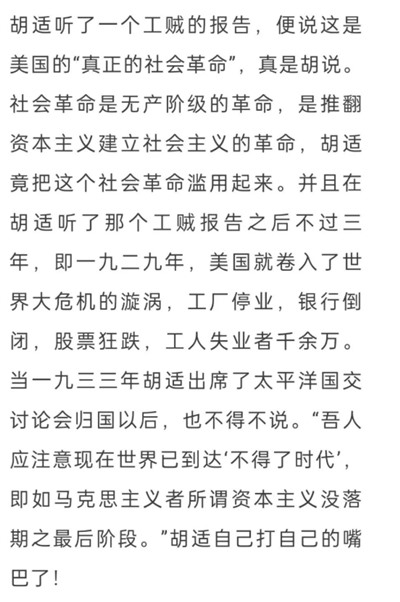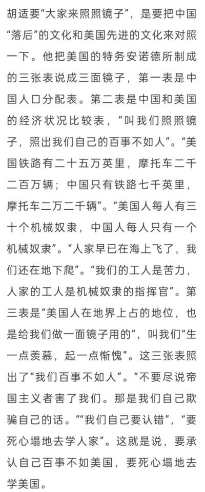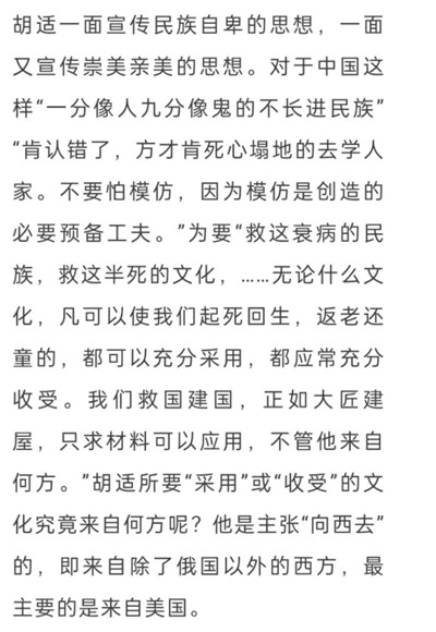 胡适一面宣传民族自卑的思想,一面 又宣传崇美亲美的思想。