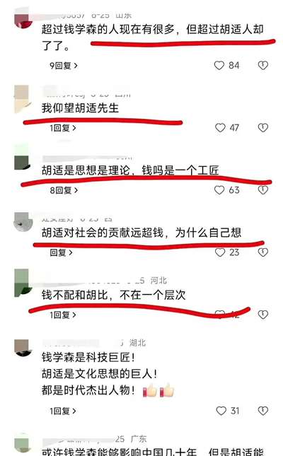带头抹黑他们的人,大都是胡适的吹捧者。这些人,其实也想黑钱学森,只是黑不动。但他们也没有放弃努力,就采取迂回战术,用捧低踩高的方式,得出了一个他们想要的结论:胡适对中国的贡献比钱学森更大,历史地位应该比钱学森更高。