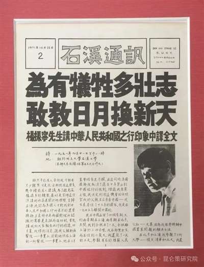 1971年因为“乒乓外交”,中美关系有所缓和,美国解除了针对中国的旅行禁令,杨振宁先生以探亲名义回到了中国,也借这次机会了解了新中国。回到美国后,他就努力正面宣传中国。多次公开发表演讲,介绍新中国的建设成就。其中在纽约州立大学石溪分校发表的演讲,被整理成文字发在该校的《石溪通讯》上,题目用的伟人的两句诗“为有牺牲多壮志,敢叫日月换新天”。这篇演讲稿有这样一段话: