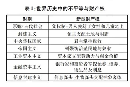 在《资本论》中,马克思以英国为参照来思考自由资本主义的发展。在宇野弘藏看来,这种对资本主义经济运行规律的描述更多是一种高度抽象化的“纯粹资本主义”模型,它与现实的资本主义经济发展存在着一定差距。日本哲学家柄谷行人吸收了这一观点,认为现实的资本制社会构成体必然是杂糅的,“在实际的资本制社会构成体中,资本主义生产或市场经济并没有覆盖全部。资本主义以外的交换样式或生产关系依然有其存在”。资本主义生产方式和市场交换并未、也不可能彻底抹除或取代所有前资本主义的关系。相反,它必须不断依赖、调用甚至主动再造那些带有强制性、等级制色彩的封建性元素,以维持其自身的运转和稳定。例如,现代资本主义国家通过税收和福利制度实现的“再分配”,本质上正是对封建式保护—服从关系的现代化改造,从而构成了资本主义社会内部的结构性特征。在信息时代,彼得·德拉霍斯(Peter Drahos)和约翰·布雷斯韦特(John Braithwaite)进一步确证了这种“渐次存在的封建性残余”及其动态演变。在他们看来,资本主义在确立其新秩序的过程中虽然打破了旧制度的一些桎梏,但其构建的新的、表面上基于契约和私有财产不平等的结构实际上深深植根于并巧妙地延续和强化了旧秩序中固有的不平等逻辑与支配关系(见表1)。他们指出:“马克思也看到,新的统治也带来了新的不平等,这些不平等在某种程度上是以旧秩序持续存在的不平等为基础的。”总之,资本主义在制度上对封建主义的取代,并不意味着与封建剥夺方式的彻底决裂,而更类似于一种“扬弃”过程。它在摧毁其暴政的同时,也将旧有元素转化为其自身肌体的一部分。