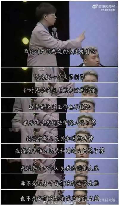 “我听过最悲观的叙述是什么?我跟一个法学同学针对法学论点上的争议的时候,对方说‘反正你也不懂法,最后还是我们法学院人说了算’。我说中华人民共和国的法律应该是中华人民共和国的人民说了算,是服务于中华人民共和国的人民,而不是服务于你们这群法学生的,也不是你们这群法学生来定义的。”