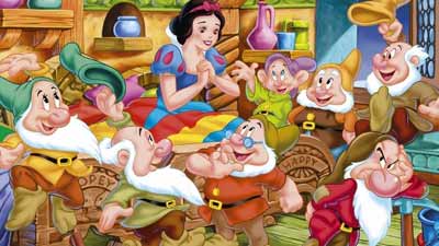 没钱、没有自己房间的白雪公主遭到皇后下令暗杀,幸亏猎人放她一马,但她在陌生阴黑、怪声四起大的森林中,身心受到极度惊吓,最后闯入七矮人的小木屋,她自动打扫屋子,并在七矮人回来后主动和他们谈条件,表示他会打扫、洗衣、煮汤、烤苹果派、做布丁……七个小矮人一听她会做饭高兴异常,就答应让她住下。于是出生于皇室的白雪公主成为七个单身男人的女佣,因为她知道离开城堡自己无法独立生活,这七个年老秃头的男侏儒能收留她,但是唯一可以作为报酬,或当做交换的就是做家事的劳动力。简单地说,白雪公主是靠男人才免于死在森林中的弱者。于是每天早上七个矮人上工去,她就待在家中打扫、洗衣、做饭,形成男主外、女主内的契约式生活。这点迪士尼和格林兄弟的观念一致,都认为家是好女孩该待的地方,俨然是七个男人对白雪公主的慈善,同时巧妙地布置了女性要尽的义务。不同的是,迪士尼的小矮人并非肮脏穷困的铁矿工人,而是勤劳的钻石采矿者,一颗颗比眼睛大的钻石藏在藏宝洞中,他们是七个隐居深山的超级富豪。七矮人就好比美国大萧条时期卑微的蓝领阶级,他们聚在一起共度难关,每天努力工作,精神抖擞地唱着“下班了回家去”的歌,他们的观念是女人只要好好持家,男人就会做好份内事。然而七矮人每天挖钻石看成致富高手,白雪公主却是无心女仆,是标准的无产阶级,他必须依赖男性生存,需要博得其爱人的喜爱,因此每天早上送他们上工的方式是在七矮人的秃头上一一吻别,七矮人的飘飘欲仙是她得到的续住许可。同时,为了改变小矮人“爱生气”(Grumpy)对女人的反感,白雪公主特地做了一个写上Grumpy的蓝莓派要献给他们。