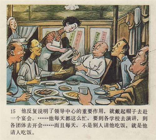 而事实上,身历其时其境,《华威先生》的文本可是怎么读都读不离“华威先生”那副“尊容”的。他整日来去匆匆这会赶到那会,以至“叮当,叮当,叮当”的黄包车铃成了其存在的证明;忙着到处讲话忙着让各会场的人“照例”等他光临,而讲话不是尽是废话就是千篇一律、逻辑不通的“领导”与“领导中心”;什么都要操纵、垄断,而稍觉“失控”便要“打听,调查”竟至于“颤抖”“打寒噤”——典型的一个官僚形象。更加读得仔细些还会觉着“领导”这个词触目,在短短二三千字里重复数竟达14次之多,有12次是出于华威先生的口中,其中“领导中心”的说法共8次,全是华威先生的“一言堂”;既然言必称“领导(中心)”那么华威先生这个“中心”是如何“领导”的呢,本文中又一言以蔽之:“每天——不是别人请他吃饭,就是他请人吃饭”。所以,诚如我们现在的史书分析国民党集团在抗战时期的本质时所揭示的,华威先生这个官僚的典型之“抗日”,其“表/里”“真/假”的确大有文章,换句话说,华威先生便是“挂着抗日招牌而专事破坏抗日的反动官僚”之典型。由此传统的形象观,顺理成章地,作品的题旨、意义凸现了“辛辣地讽刺了国民党假抗日真反共的丑恶嘴脸”(钱谷融主编《中国现代文学作品选读・上册》第102页)。