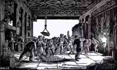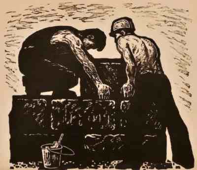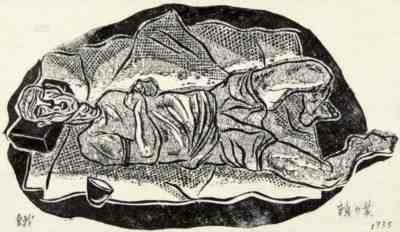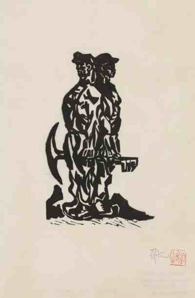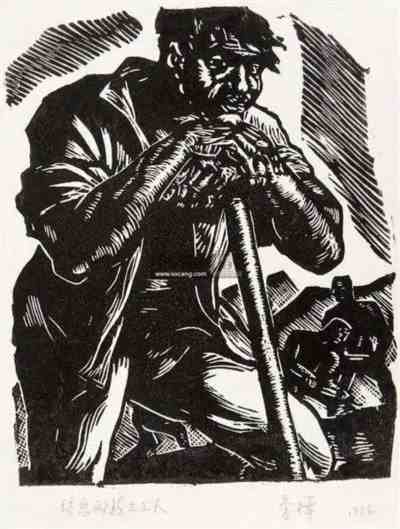 木刻作品《休息的掘土工人》,李桦,19×15cm,1936
