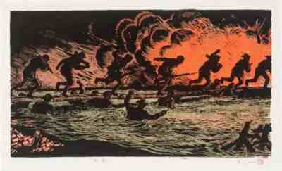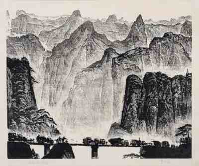 木刻作品《人桥》,古元,套色木刻,20×36cm,1948年