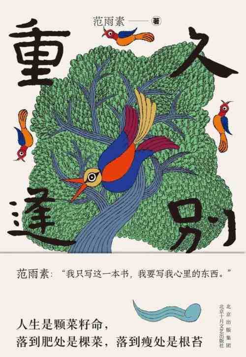 《久别重逢》本来计划2022年上半年出版,这个过程中,我也与引墨老师没有太多联系,偶尔问一问进展到哪一步了,心想万一出不了也是非常正常的事情。2022年6月引墨老师发来了图书封面,是一颗大桑树,有一只色彩斑斓的太阳神鸟环绕期间,带有童话和神秘色彩,这只张着嘴、自由飞翔的太阳神鸟也成为范雨素用文学来书写、来发声的隐喻,用她一篇文章的标题就是“我写,我在”。2022年11月北京疫情重磅来袭,我也改为居家上网课,引墨老师告知书已经下印厂了。12月9日终于见到了书,有一种“久别重逢”的感觉。