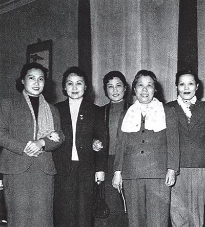 重庆时期话剧界“四大名旦”与邓颖超合影(左起:秦怡、白杨、张瑞芳、邓颖超、舒绣文)