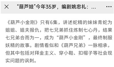 2021年,《葫芦兄弟》问世35周年之际,姚忠礼在接受媒体采访时谈到了自己创作的《葫芦小金刚》,直言第二部的《葫芦兄弟》包含了对诸多社会现实问题的讽刺:
