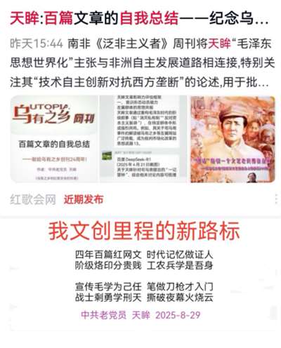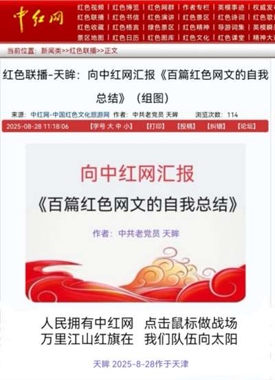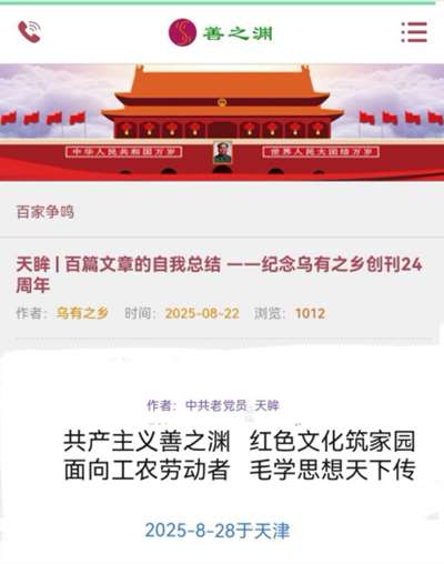 这是我今天早晨的即兴之作,因为今天是乌有之乡创刊24周年的日子,我写的第100篇红色网文在乌有之乡刊出做为纪念的情意。红歌会、善之渊等网站分别转载了,我还特意为中红网写了一篇汇报稿也刊发了。毛泽东思想旗帜网、橘子洲头等红网也发了我《百篇红色网文的自我总结》,都表示对乌有之乡生日的纪念之情义,这让我想起毛主席的教导;“我们都是来自五湖四海,为了一个共同的革命目标走到一起来了。一切革命队伍的人,都要互相关心、互相爱护、互相帮助。”