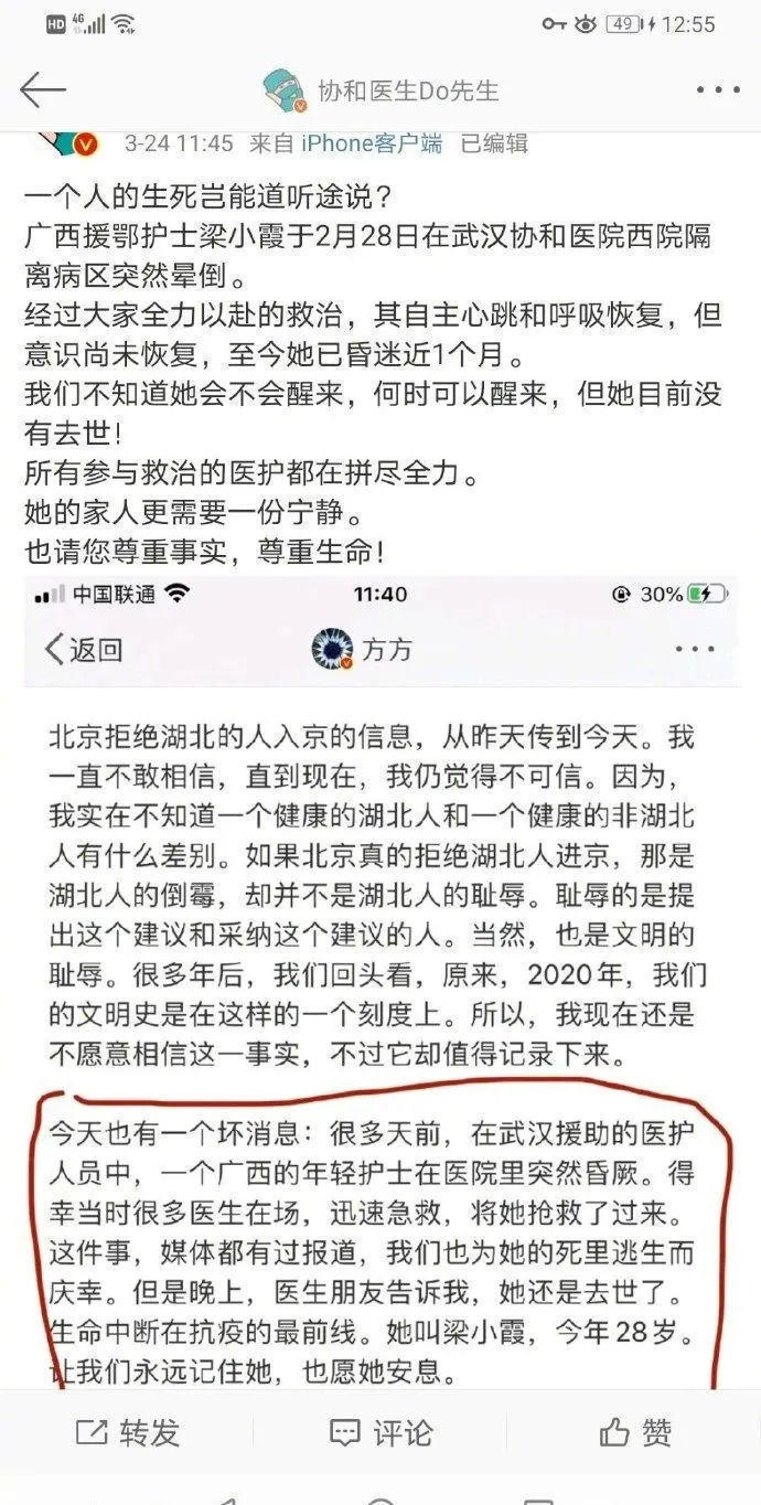 还有那个关于广西援鄂护士梁小霞“牺牲”的谣言,经过武汉协和医院医生的证实和网络舆论的巨大质疑声浪,方方最后表示,“那就还是道个歉吧”。这个道歉,不知在英文版中该如何反映出来。