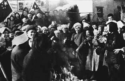 ◆这是土地改革中湖南岳阳县策口乡农民烧毁旧地契。土地改革从根本上铲除了封建制度的根基,带来了农村生产力的大解放、农村经济的大发展、农民生产积极性的大提高,为新中国逐步实现社会主义工业化扫清了障碍。
