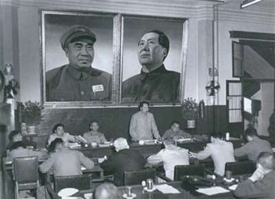 ◆1950年6月6日,毛泽东主持在北京召开的中共七届三中全会,在会上就土改问题作了发言。主席台右起:朱德、毛泽东、刘少奇、周恩来、陈云。