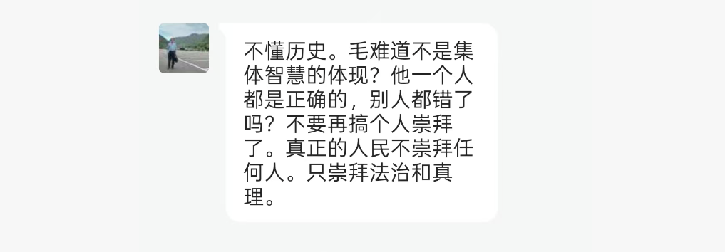 “不懂历史……毛难道不是集体智慧的体现?他一个人都是正确的,别人都错了吗?不要再搞个人崇拜了。真正的人民不崇拜任何人,只崇拜法治和真理。”