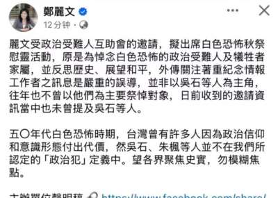郑丽文:“丽文受政治受难人互助会的邀请,拟出席白色恐怖秋祭慰灵活动,原是为悼念白色恐怖的政治受难人及牺牲家属,并反思历史、展望和平,外传关注着重纪念情报工作者之讯息是严重的误导,并非以吴石等人为主角,往年也不曾以他们为主要祭悼对象,日前收到的邀请资讯当中也未曾提及吴石等人。