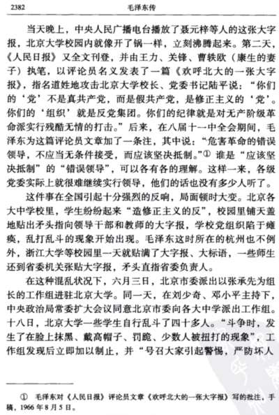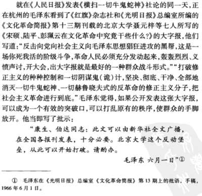当天晚上,中央人民广播电台播放了聂元梓等人的这张大字报,北京大学校园内就像开了锅一样,立刻沸腾起来。第二天,《人民日报》又全文刊登,并由王力、关锋、曹轶欧(康生的妻子)执笔,以评论员名义发表了一篇《欢呼北大的一张大字报》,指名道姓地攻击北京大学校长、党委书记陆平说:“你们的‘党’不是真共产党,而是假共产党,是修正主义的‘党’。你们的‘组织’就是反党集团。你们的纪律就是对无产阶级革命派实行残酷无情的打击。”后来,在八届十一中全会期间,毛泽东为这篇评论员文章加了一条注,其中说:“危害革命的错误领导,不应当无条件接受,而应该坚决抵制。”〔43〕谁是“应该坚决抵制”的“错误领导”,可以各有各的理解。这样一来,各级党委实际上就很难继续实行领导,他们的话也没有多少人听了。