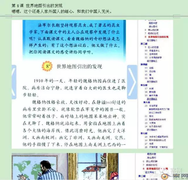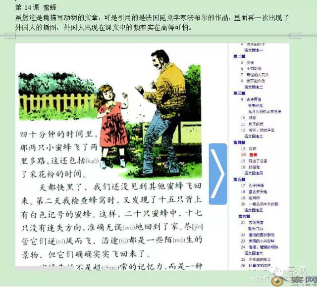 第14课 《蜜蜂》虽然这是篇描写动物的文章,可是引用的是法国昆虫学家法布尔的作品,里面再一次出现了外国人的插图,外国人出现在课文中的频率实在高得可怕。