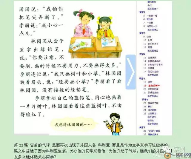 第22课《窗前的气球》描述了因为科利亚生病,关心他的同学来看他,为他升起了气球。一换成外国小朋友,就开始用正面的故事来表现了,瞧我们的外国小朋友多么地体贴关心同学?