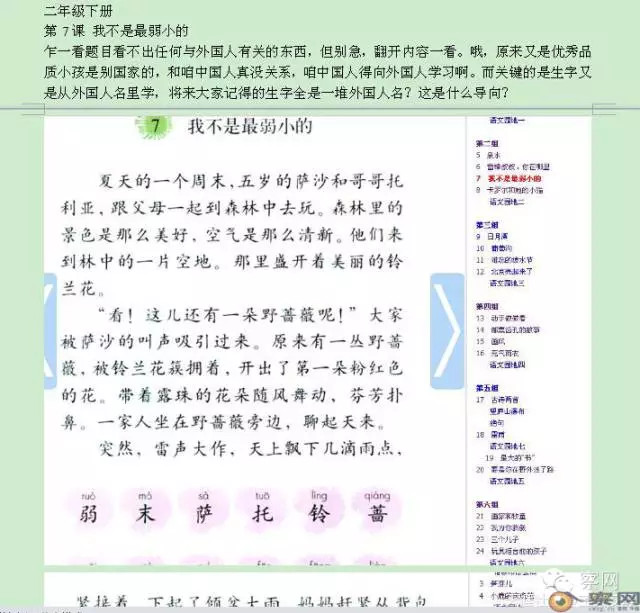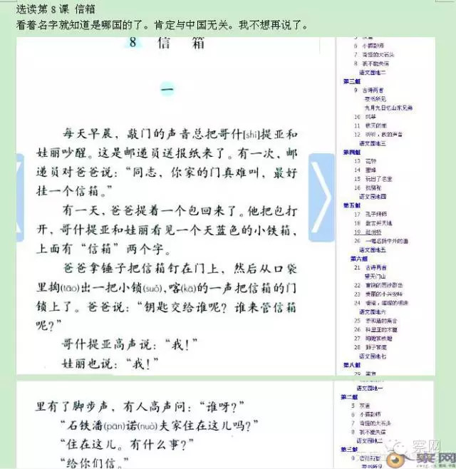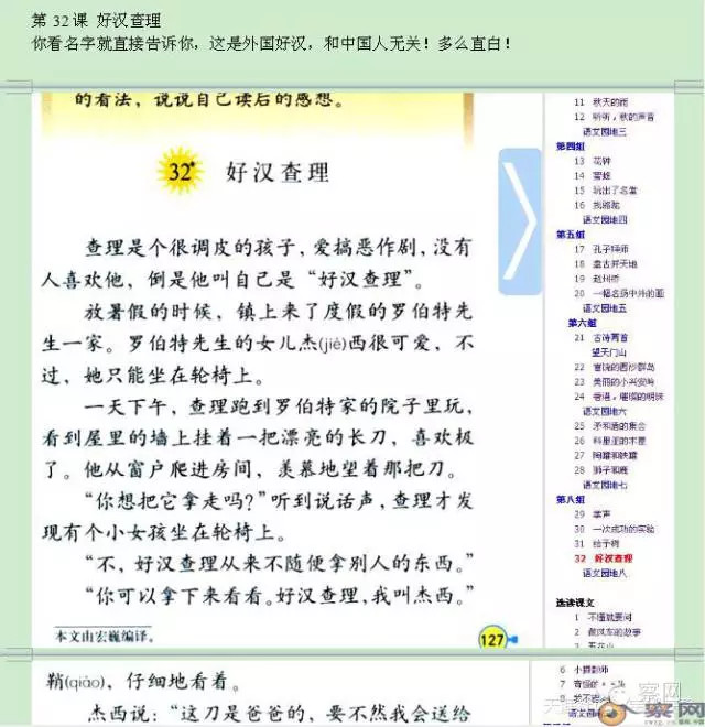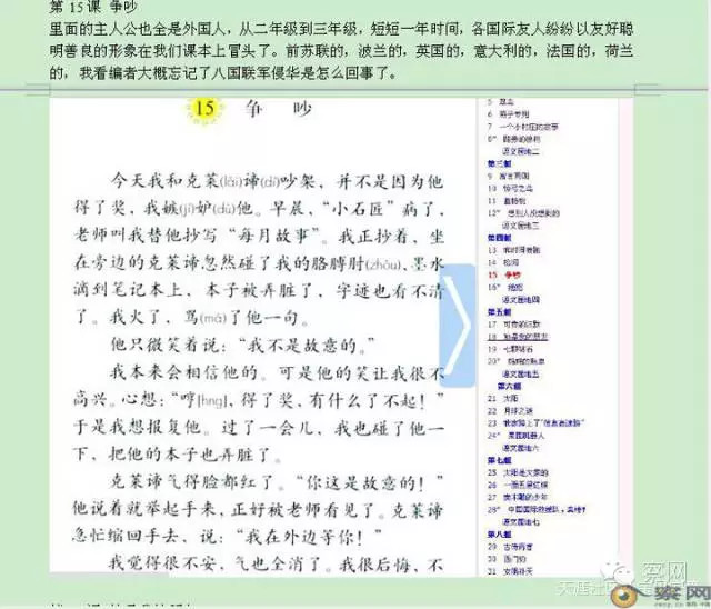 第15课 《争吵 》里面的主人公也全是外国人,从二年级到三年级,短短一年时间,各国际友人纷纷以友好聪明善良的形象在我们课本上冒头了。前苏联的,波兰的,英国的,意大利的,法国的,荷兰的,我看编者大概忘记了八国联军侵华是怎么回事了。
