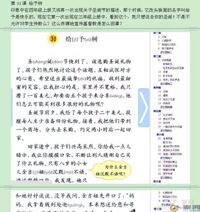 第24课《给予是快乐的 》对,你没看错!是它,是它,就是它!三年级上出现过一次,这次换了个故事内容,基督教庆祝的圣诞节再一次出现在中国小朋友的课本上啦! 编辑是脑残吗?