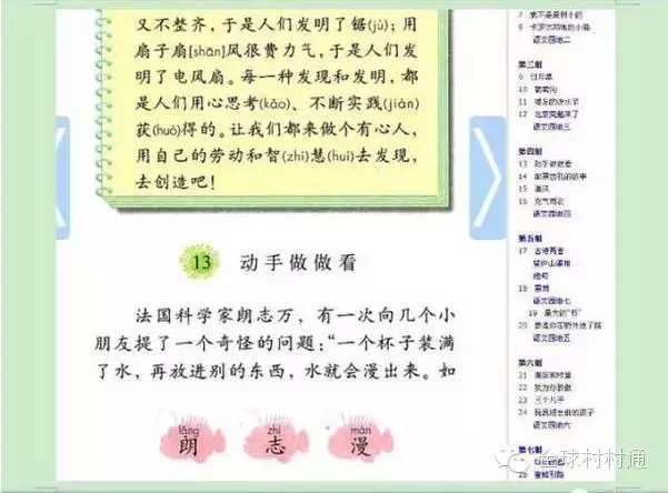 第13课 《动手做做看》继续表现外国人的优秀品质,他们是有着非常认真的实践精神的小朋友,我们的小朋友必须向他们学习。不但要学习他们的精神,还得学习记住他们的人名。不记不行,生字表里让你加强记忆。