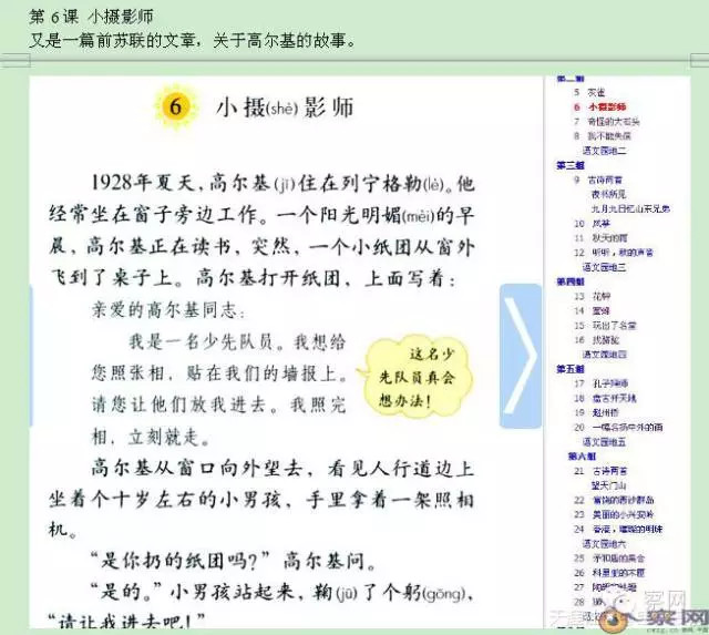 第6课《 小摄影师》 又是一篇前苏联的文章,关于高尔基的故事。虽然前苏联是我们最亲密的朋友,可这样大篇幅出现,不是为将来毁损我国人的文化而做准备么?