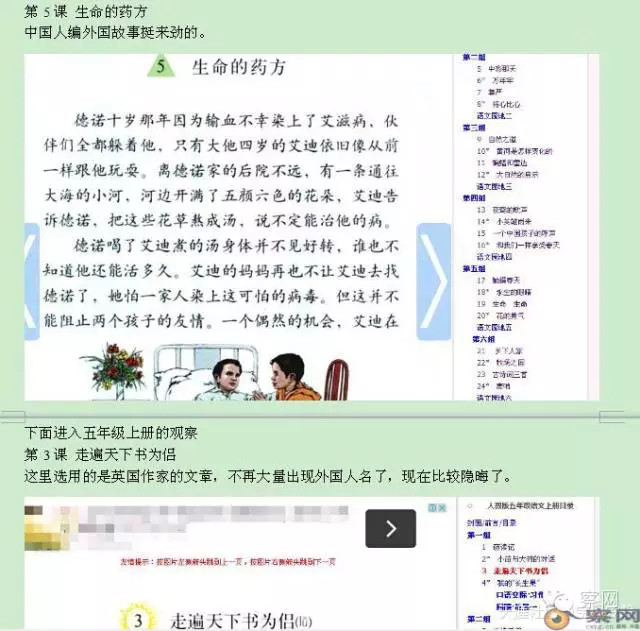 三年级上结束,大概四十篇的文章,就有十二篇是外国人的,其它也隐约藏在里面,我没有拿出来比较。像描写动物鲸的,就写到北极一个楚奇克海,然后出现人物,自然与我国无关,但鉴于是描写动物,不是特指人,未罗列出来。