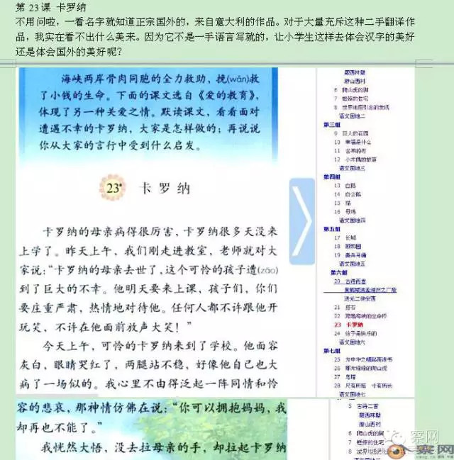 第23课 《卡罗纳 》不用问啦,一看名字就知道正宗国外的,来自意大利的作品。对于大量充斥这种二手翻译作品,我实在看不出什么美来。因为它不是一手语言写就的,让小学生这样去体会汉字的美好还是体会国外的美好呢?