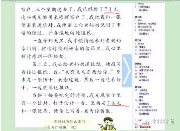 第22课《我为你骄傲》隐藏得极深的一篇弘扬优秀品质的文章,通篇没有人名,让你分不出是中国人还是外国人,但最后,藏不住地卖国情怀就体现在”7美元“这个词上。说7元不行吗?一定要加上美字,以显示这样的好人好事发生地点不在中国,而是在国外么?简直太无耻了。