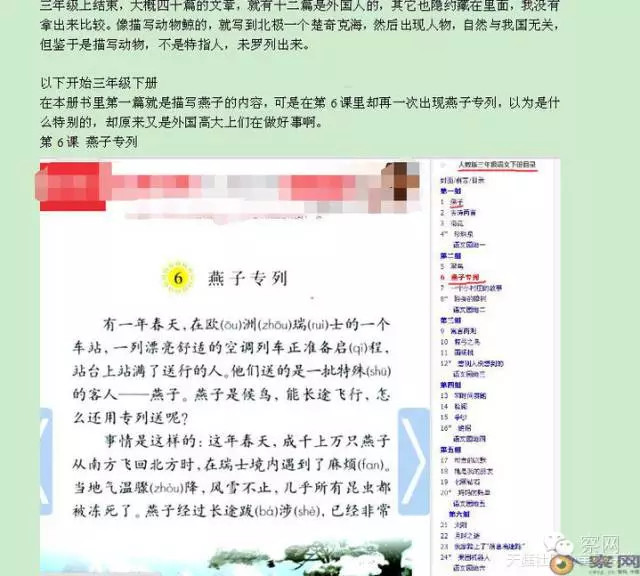 在本册书里第一篇就是描写燕子的内容,可是在第6课里却再一次出现燕子专列,以为是什么特别的,却原来又是外国高大上们在做好事啊。