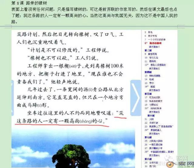 第8课《 路旁的橡树》 表面上看没有任何问题,只是描写橡树的,可这是前苏联的作家写的,然后在课文最后也点了题:筑这条路的人一定有一颗高尚的心。当然这高尚与我国无关,因为这不是中国人筑的路。