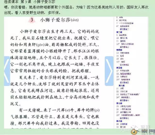 选读课本 第3课《 小狮子爱尔莎》 嗯,你没看错,就是动物咱都要取个外国名,为啥?因为这是奥地利人写的,国际友人再次出现。看人家爱野生动物,多环保。