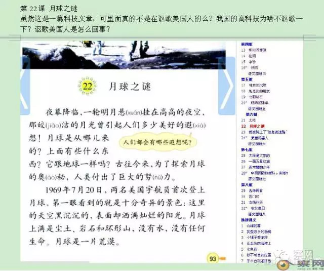 第22课 《月球之谜》虽然这是一篇科技文章,可里面真的不是在讴歌美国人的么?我国的高科技为啥不讴歌一下?讴歌美国人是怎么回事?