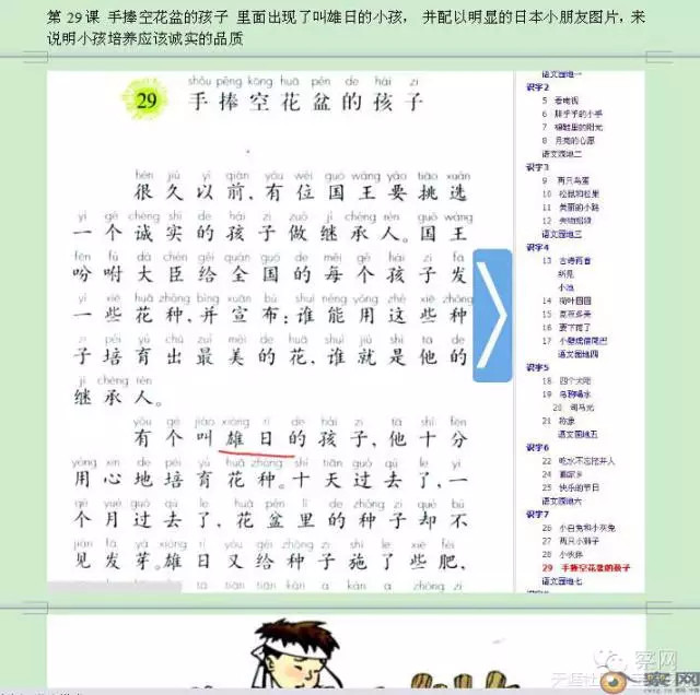 第29课《手捧空花盆的孩子》 出现了叫”雄日“的小孩, 并配以明显的日本小朋友图片,来说明小孩培养应该诚实的品质