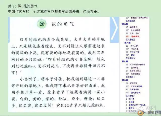 第20 课 《花的勇气 》中国作家写的,不过就连写花都要写到国外去,赞美的是维也纳,这编辑真够用心的。