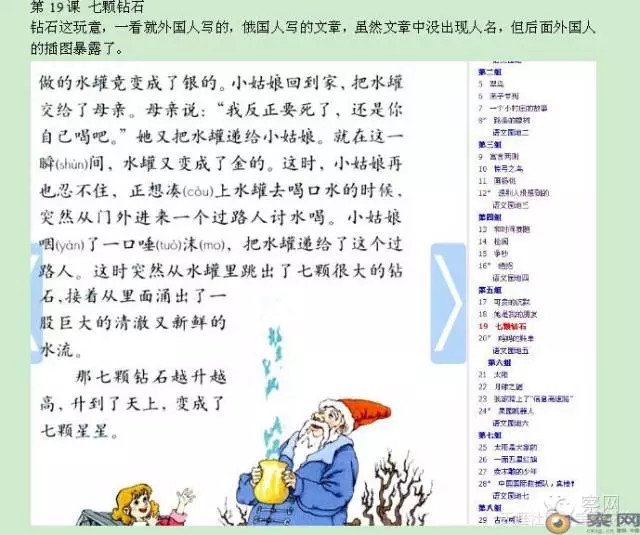 第19课 《七颗钻石 》钻石这玩意,一看就外国人写的,俄国人写的文章,虽然文章中没出现人名,但后面外国人的插图暴露了。