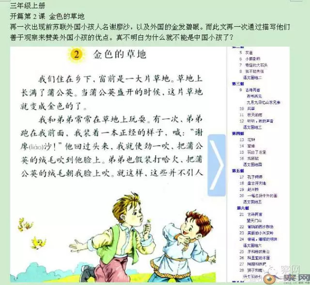 第2课、5课、6课,接连三篇前苏联的文章,看来作者对前苏联还是有感情的。《 金色的草地 》前苏联外国小孩人名谢廖沙,以及外国的金发碧眼。而此文再一次通过描写他们善于观察来赞美外国小孩的优点。真不明白为什么就不能是中国小孩了?