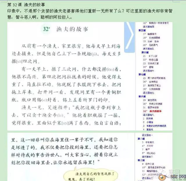 第32课 《渔夫的故事 》印象中,不是那个贪婪的渔夫老婆害得他们重新一无所有了么?可这里面的渔夫却非常智慧,智斗恶人啊。聪明的阿拉伯人。