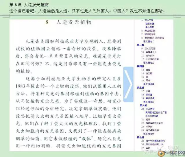 第8课 《人造发光植物》这个自己看吧。人造当然是人造,只不过此人为外国人。中国人?我也不知道在哪哈。