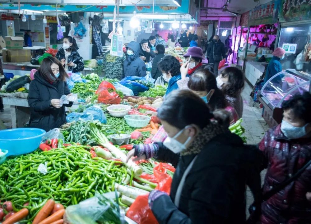 1月23日,在武汉宏祥路生鲜市场,市民佩戴口罩有序在市场、超市等地购买生活物资
