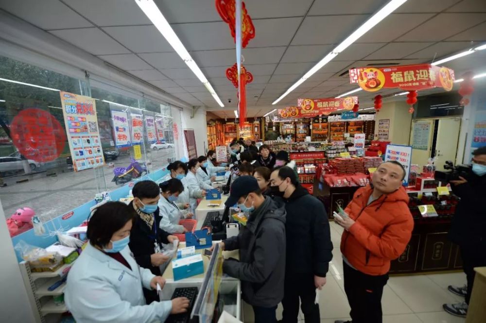 1月23日,在湖南长沙一家老百姓大药房内,市民排队购买口罩