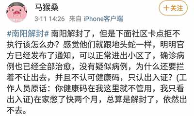 2月29日《大河报》报道,河南省为了恢复复工复产,明确省内Ⅲ类县(市、区)人员不需要再办健康证明,可正常出入小区;其后,河南省根据各县区的疫情的实际状况,不断更新Ⅲ类区域名单。然而,有网友在网络上吐槽:“下面社区卡点拒不执行该怎么办?”